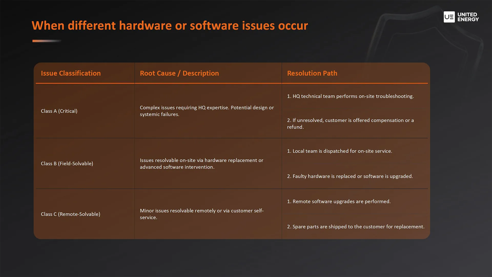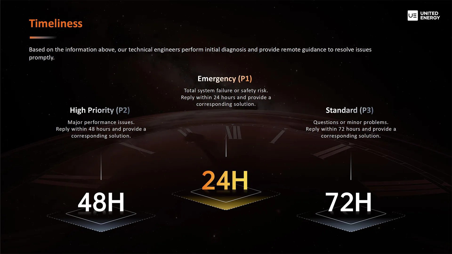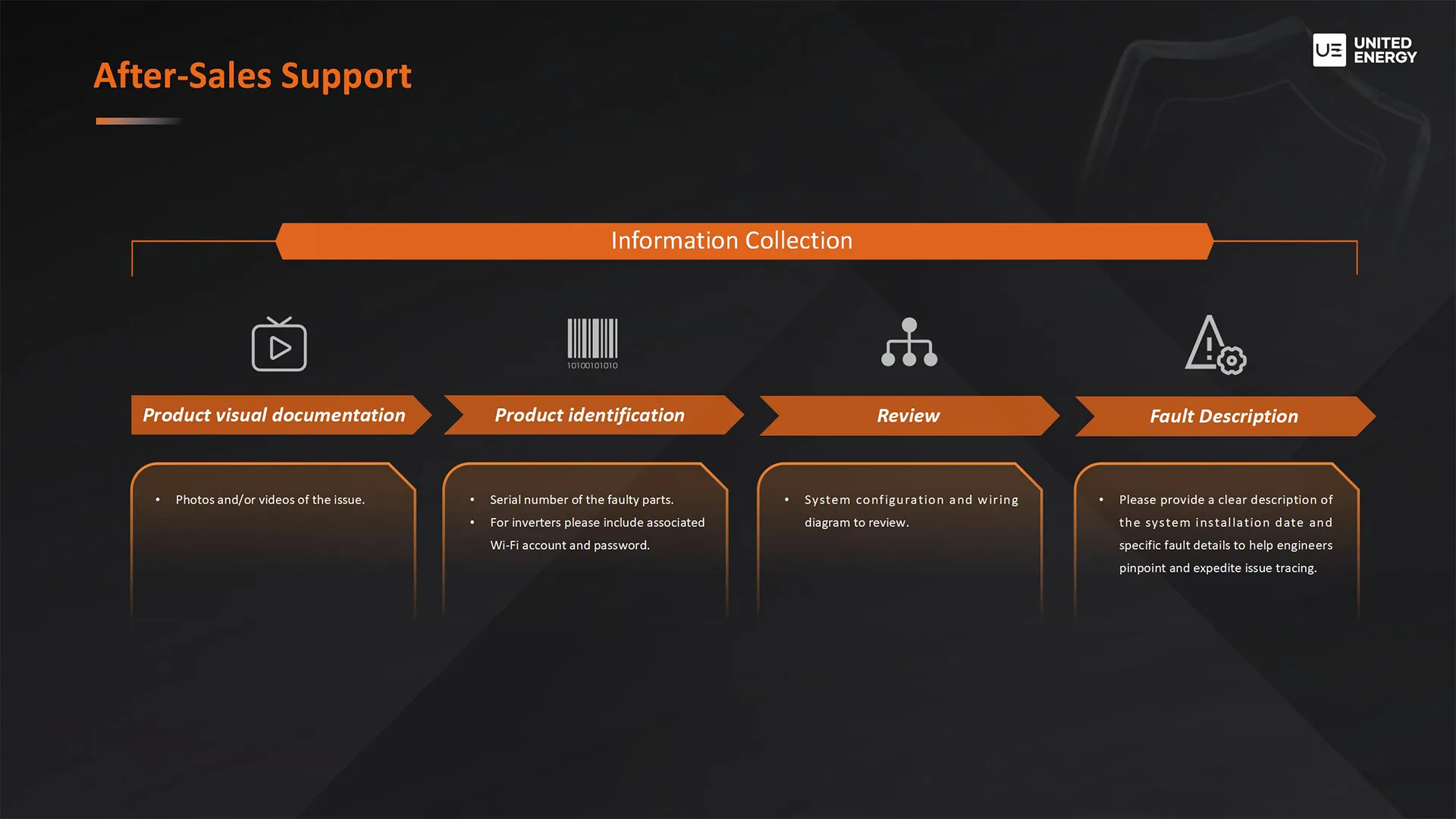 UE Solar's After-Sales Service Terms Full lifecycle service After-sales service process Information required for after-sales service Maximum time limit for after-sales feedback Problem classification and handling After-sales toolbox After-sales contact information
