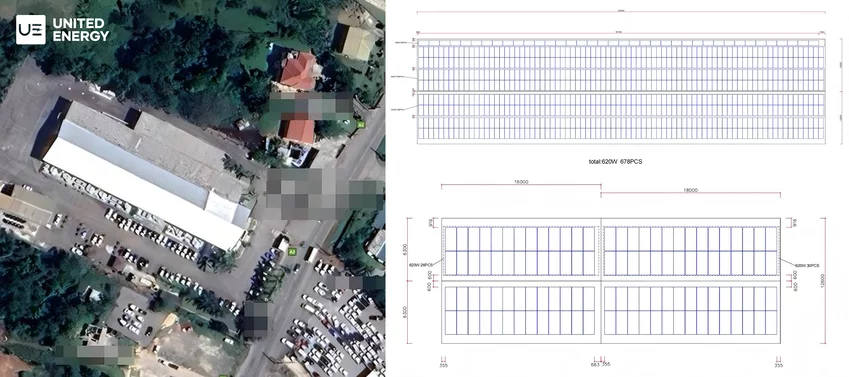 Six inverters are connected in parallel, providing a total rated capacity of 300 kW. Each inverter is paired with an individual 186 kWh lithium battery pack and approximately 80–86 kWp of PV modules. A custom metal roof mounting solution was engineered to ensure structural integrity and optimal panel positioning.